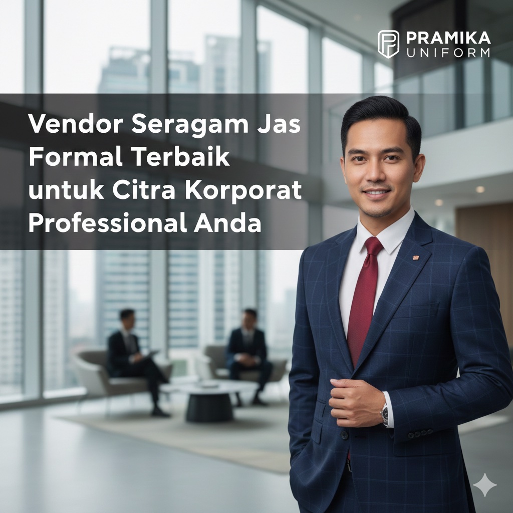 | Instruksi Gambar | Orientasi: Landscape. Karakter: Mirip Bagus, mengenakan suit modern navy/abu. Logo: PRAMIKA UNIFORM pojok kanan atas. Background: Kantor modern/Lobby. Teks: “Vendor Seragam Jas Formal Terbaik untuk Citra Korporat Profesional Anda” (Font Poppins-like). |